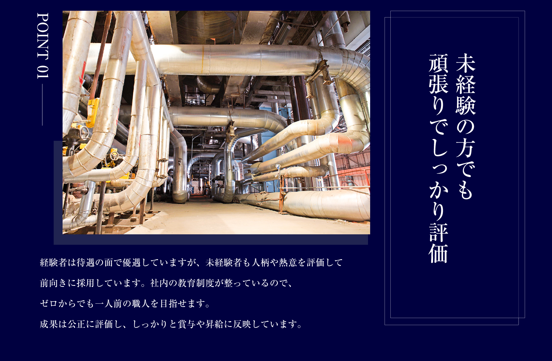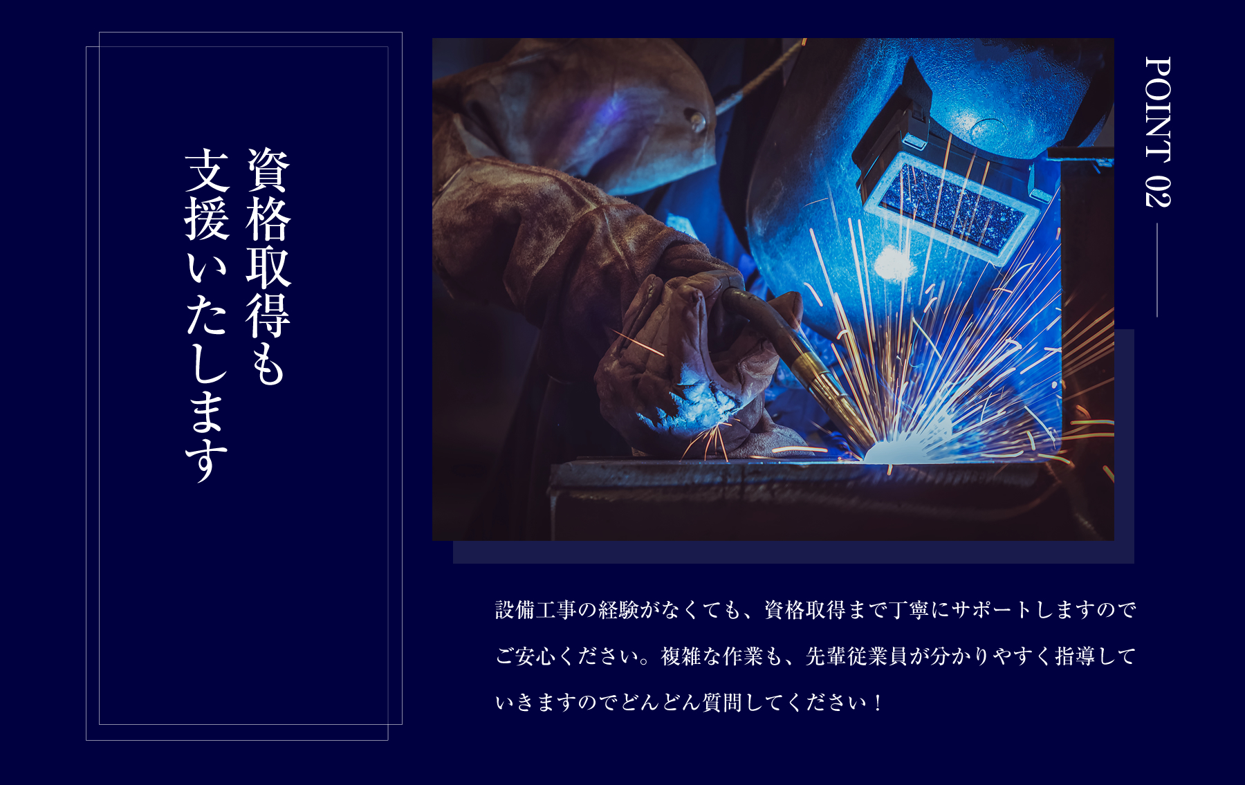 | 仕事内容 | 各種プラント・設備配管工事 建築設備 各種溶接・鍛冶工事 |