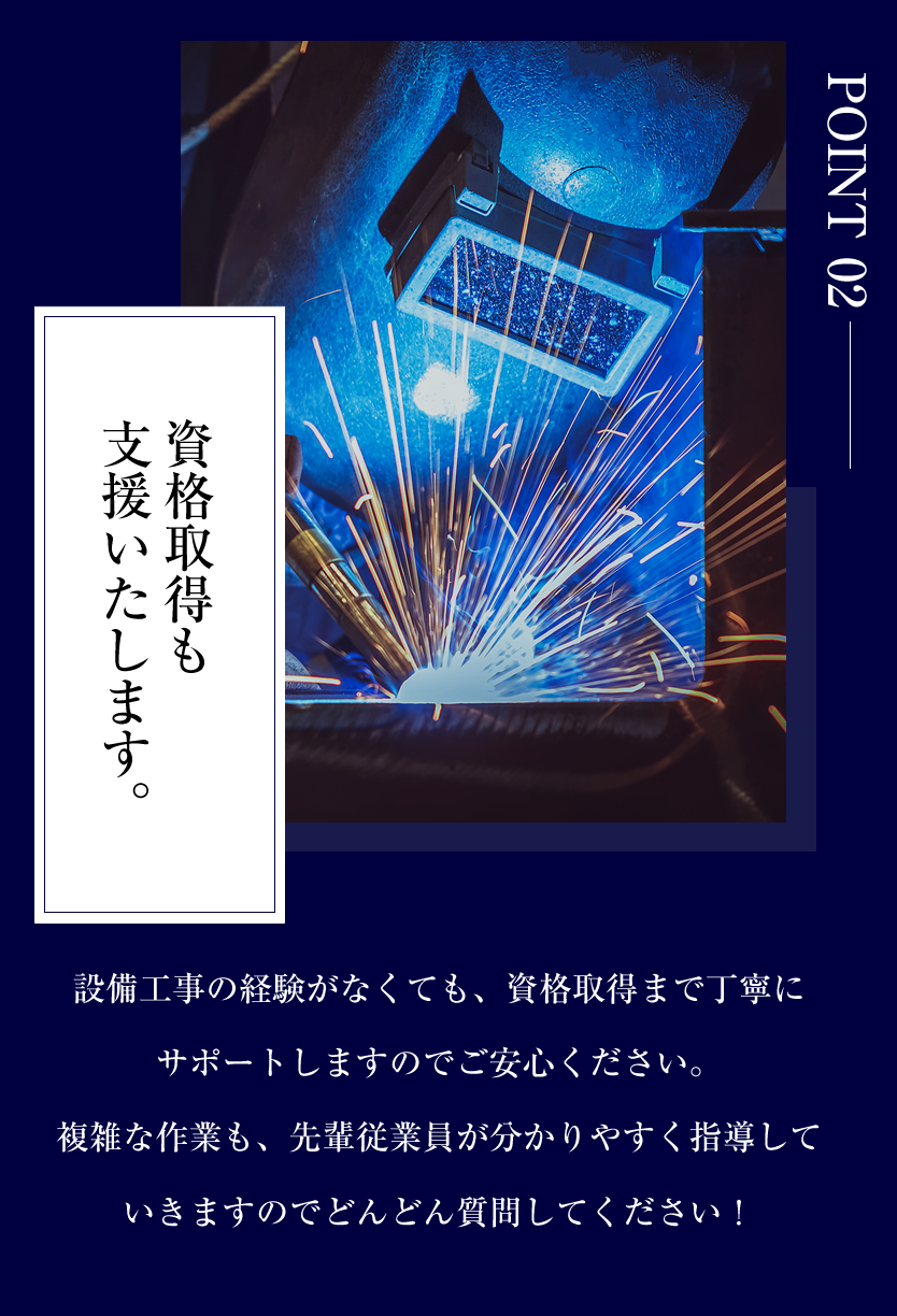 ○玉掛作業者 〇各種溶接資格 ○小型移動式クレーン等 ○土木施工管理技士 ○管工事施工管理技士