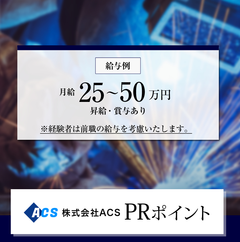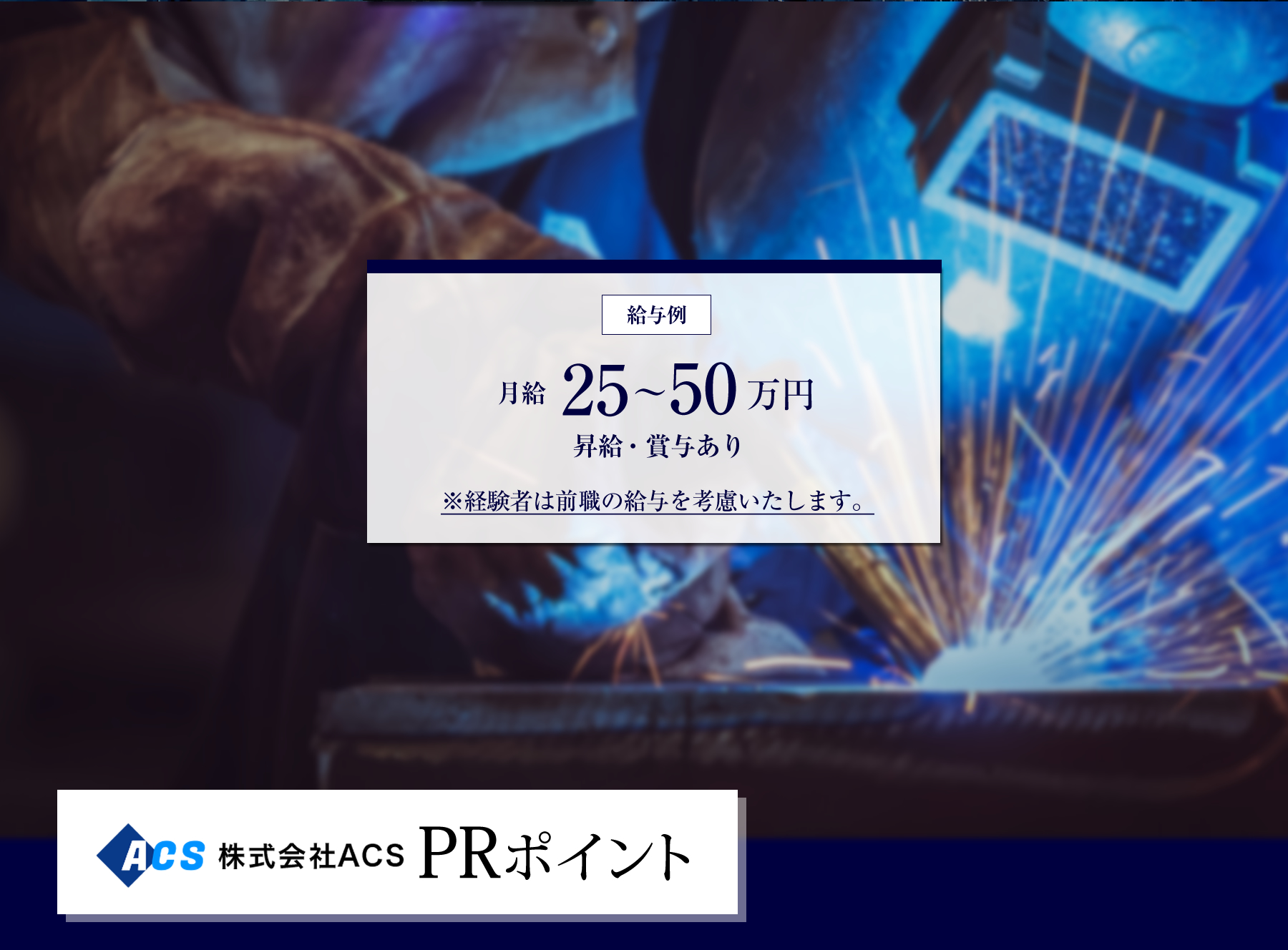 株式会社ACSの主力業務は配管工事・溶接加工です。溶接、配管設備工事やプラントの配管工事、設備等の設置・メンテナンスなどの業務を担当していただきます。 鍛冶工事や溶接工事のご経験がある方は、そのスキルを存分に発揮できる環境です。また、玉掛け、ガス溶断、アーク溶接など国家資格など全面的にサポート!、溶接関係など工事に必要な資格を取得するためのサポート体制を整えています。
