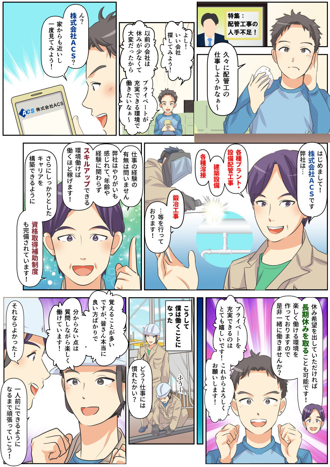株式会社ACSの主力業務は配管工事・溶接加工です。溶接、配管設備工事やプラントの配管工事、設備等の設置・メンテナンスなどの業務を担当していただきます。 鍛冶工事や溶接工事のご経験がある方は、そのスキルを存分に発揮できる環境です。また、玉掛け、ガス溶断、アーク溶接など国家資格など全面的にサポート!、溶接関係など工事に必要な資格を取得するためのサポート体制を整えています。