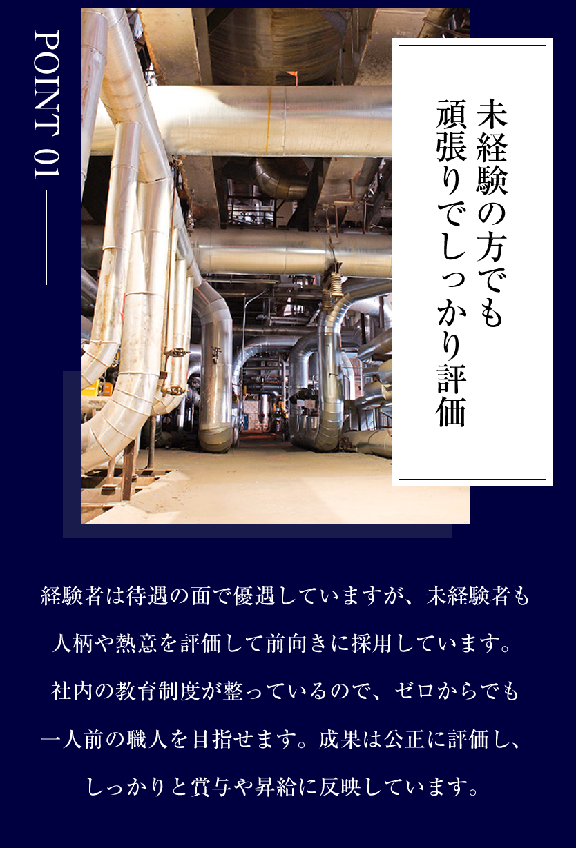 | 仕事内容 | 各種プラント・設備配管工事 建築設備 各種溶接・鍛冶工事 |